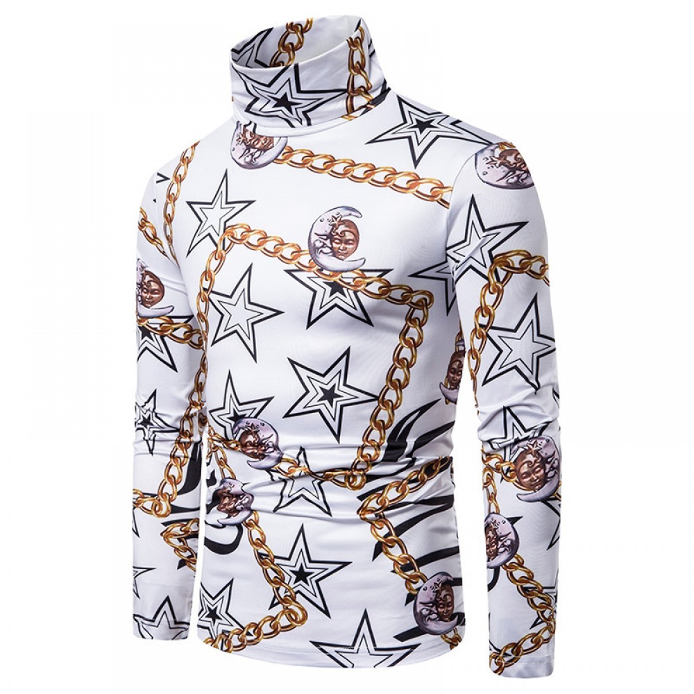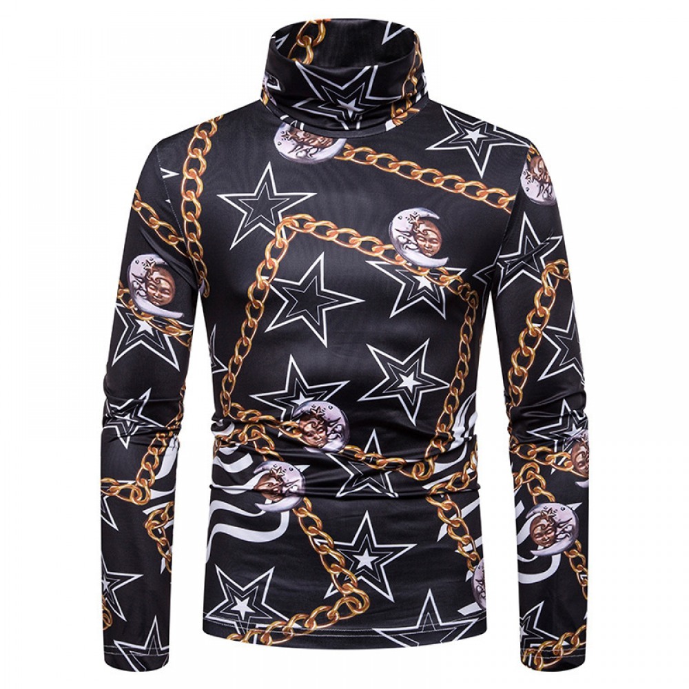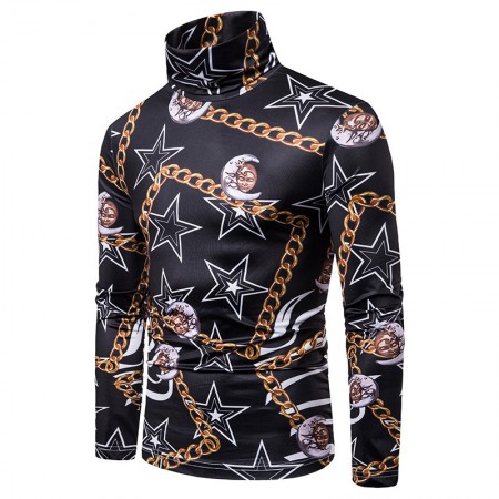 New Men's Large Size 3D Star Chain Print High Neck Long Sleeve T-Shirt Bottoming Shirt